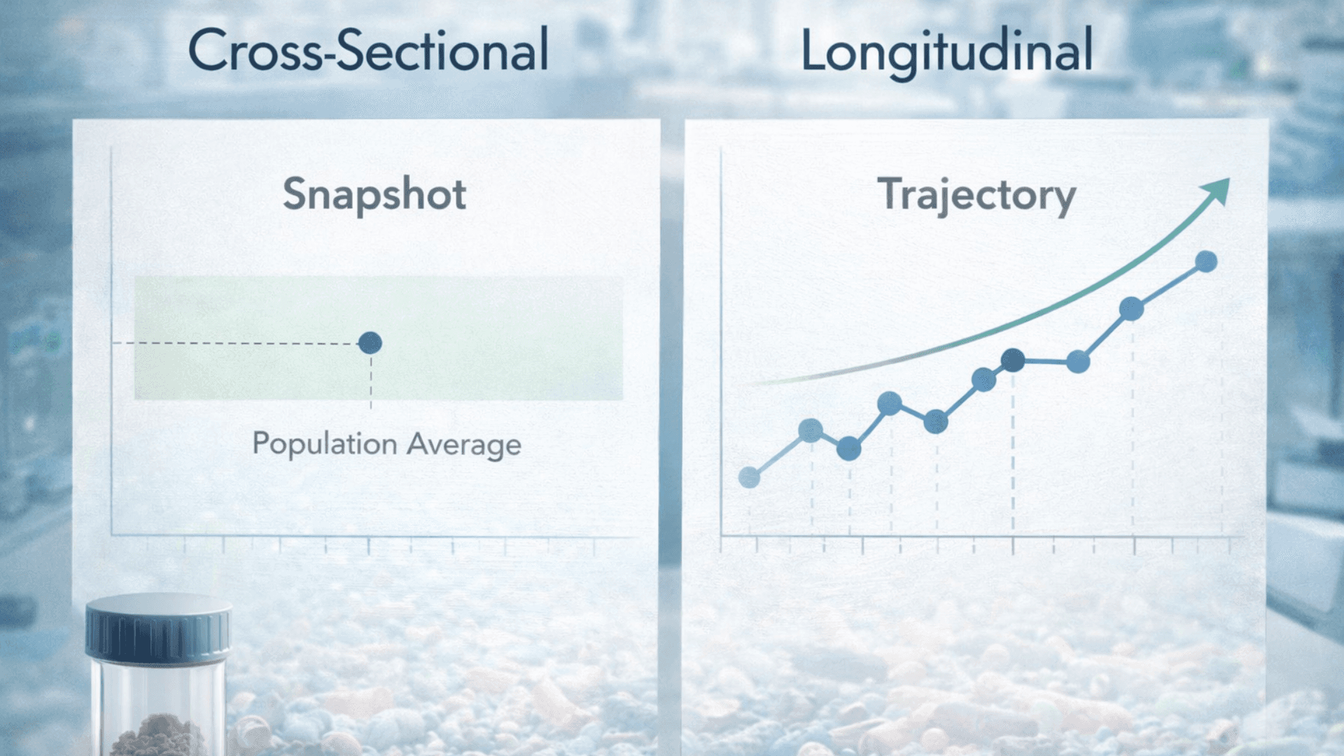 Most commercial microbiome tests are cross-sectional: • One time point • Compared to population averages • Deviation interpreted as abnormal • Recommendations based on a single reading But nearly everything we know about the microbiome comes from longitudinal studies—repeated measurements over time. This distinction matters because it affects how your results are interpreted.